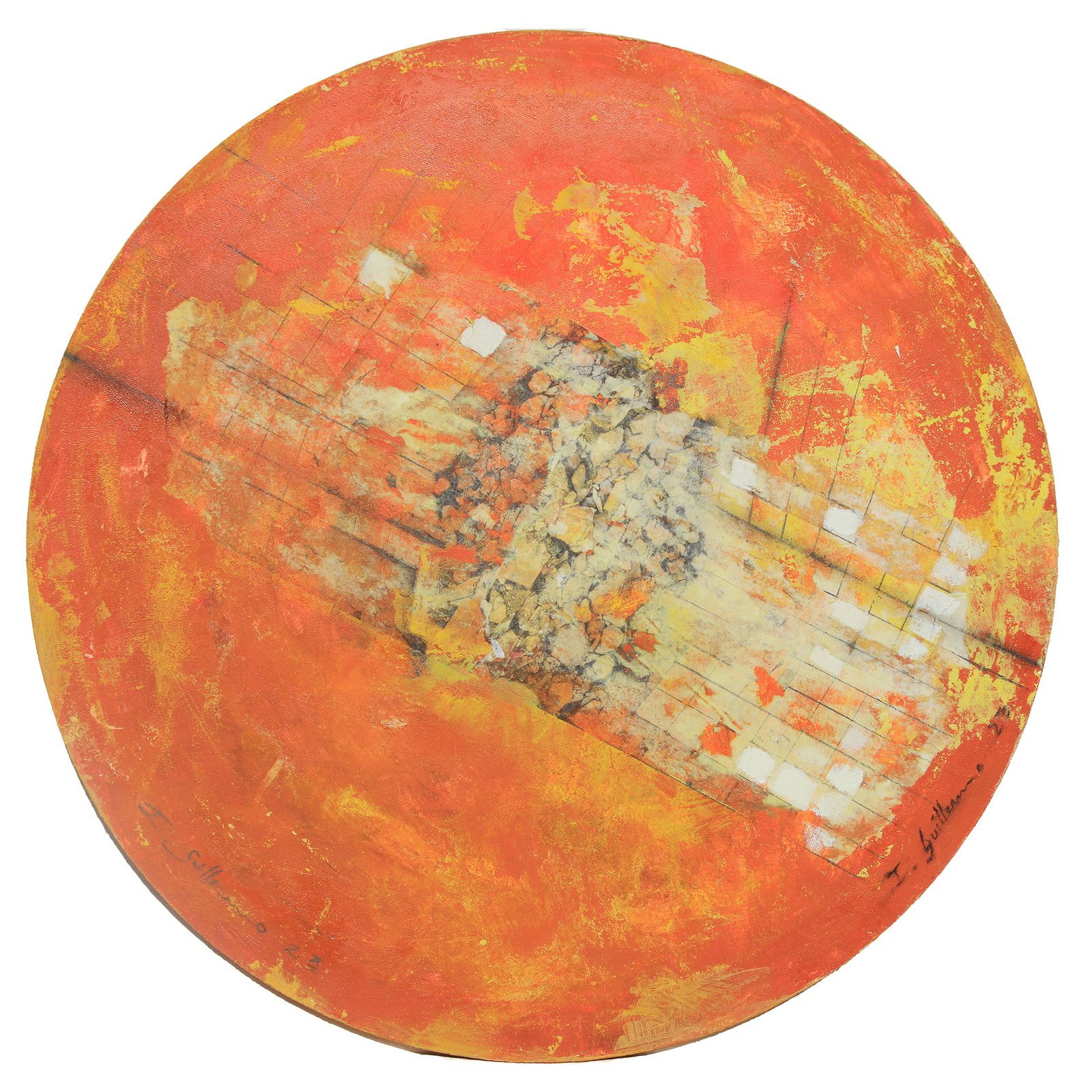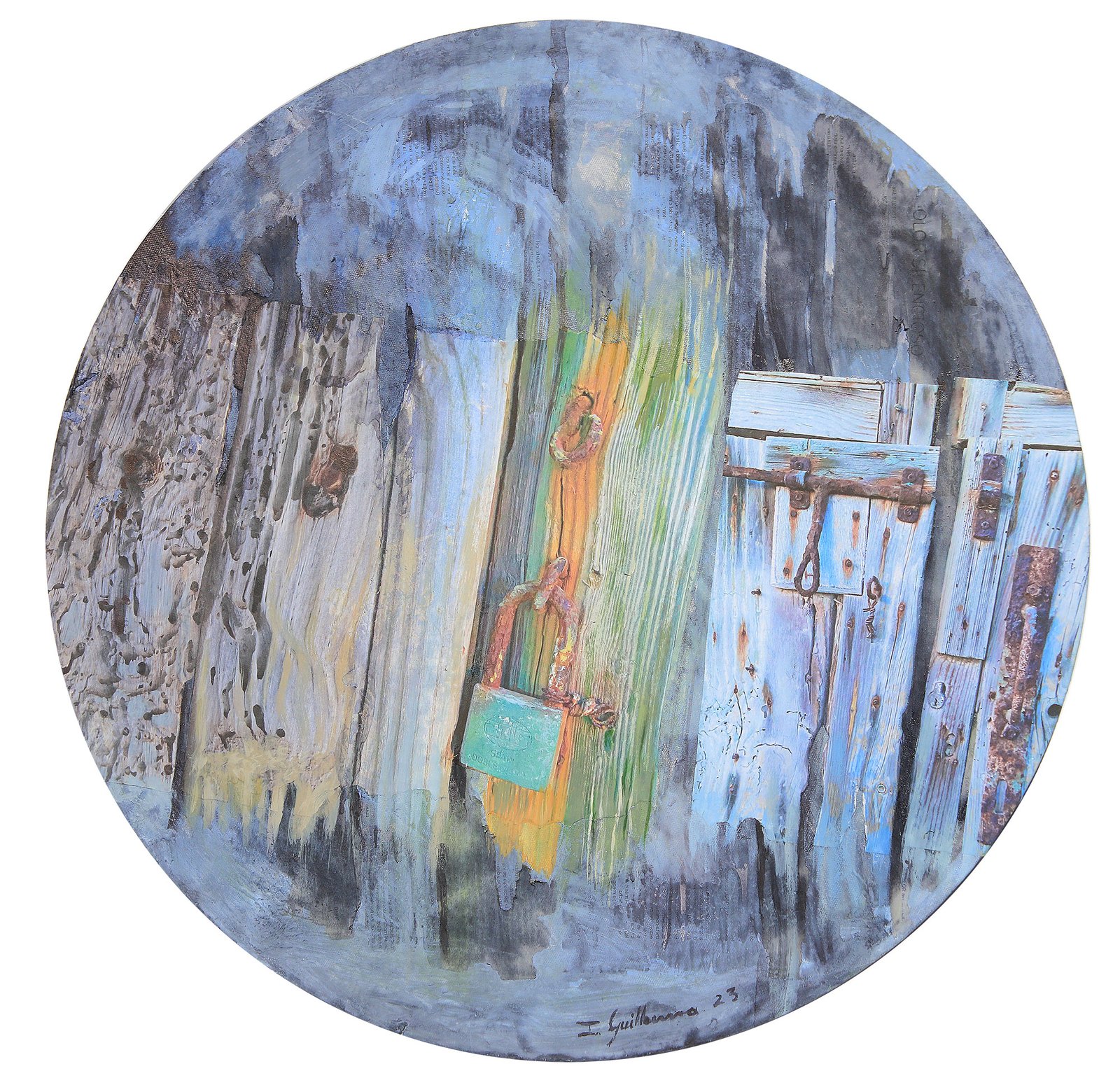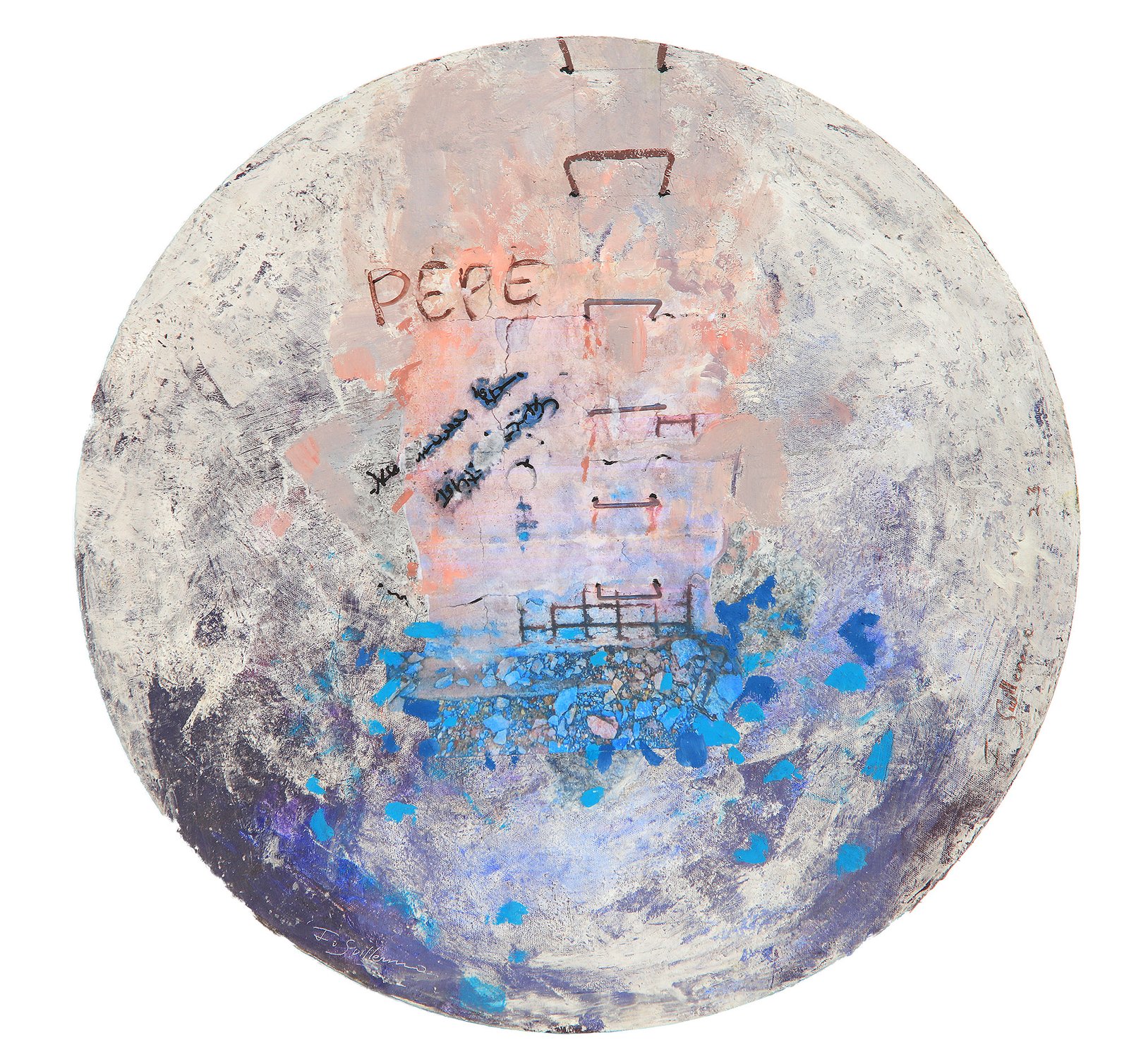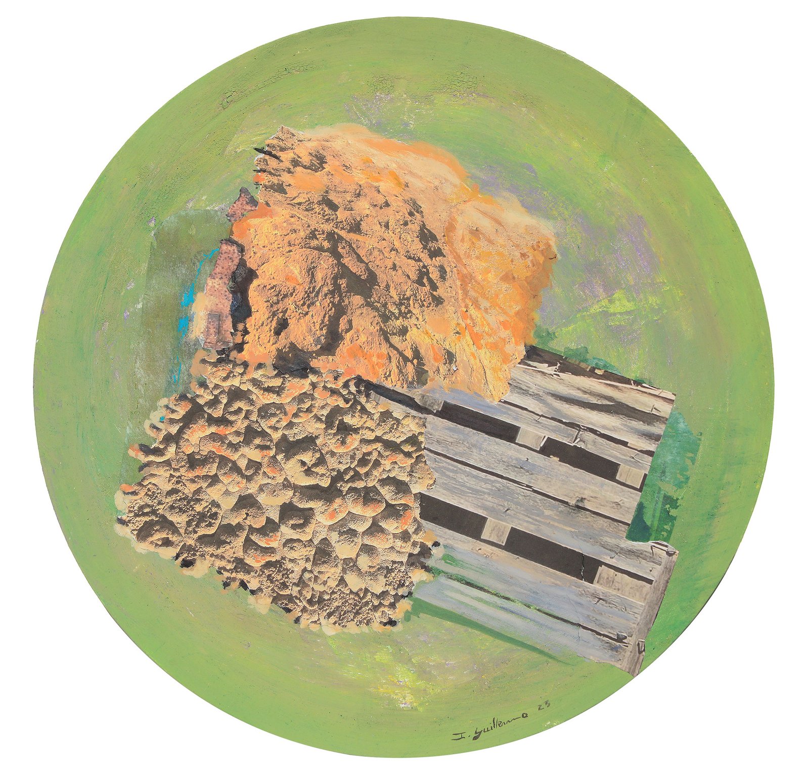 La forma circular se asocia con lo perforado y con los túneles de la tierra. Evoca el recuerdo de épocas difíciles, pero también de aquellas que trajeron prosperidad a nuestras tierras. Al contemplar este formato redondo anclado en la pared, se vislumbra el rostro de la luna con sus cicatrices y los metales incrustados en los poros de la piel terrestre. Se perciben vestigios de vida, impregnados de colores y pigmentos que reflejan el paisaje que llevas en la retina. Esa retina y esa memoria te transportan a recuerdos de conexión con la tierra, tu tierra.