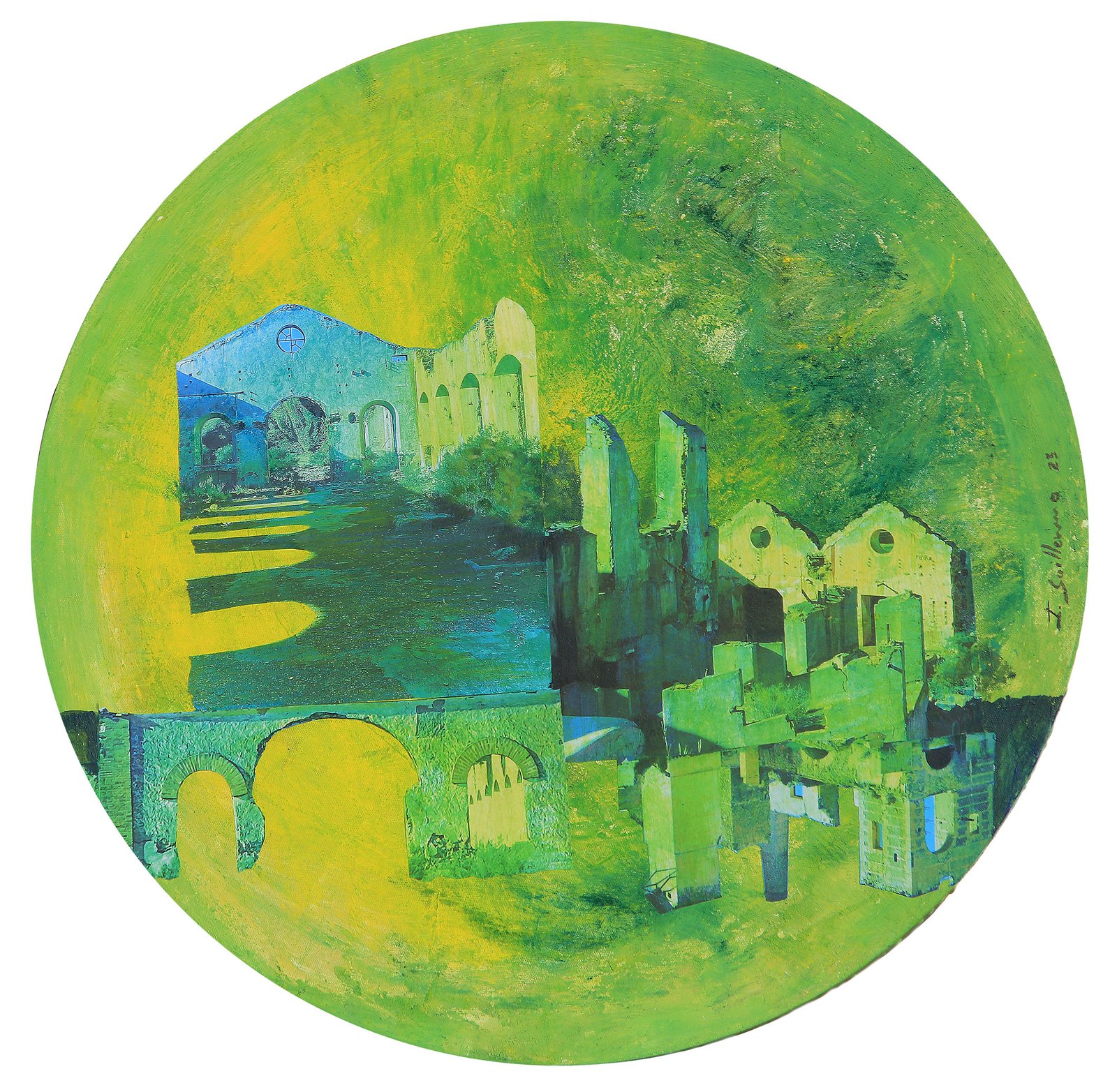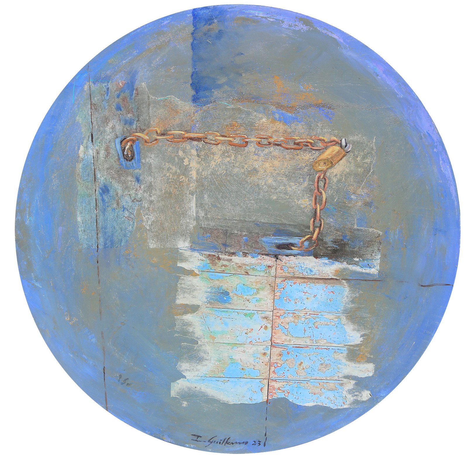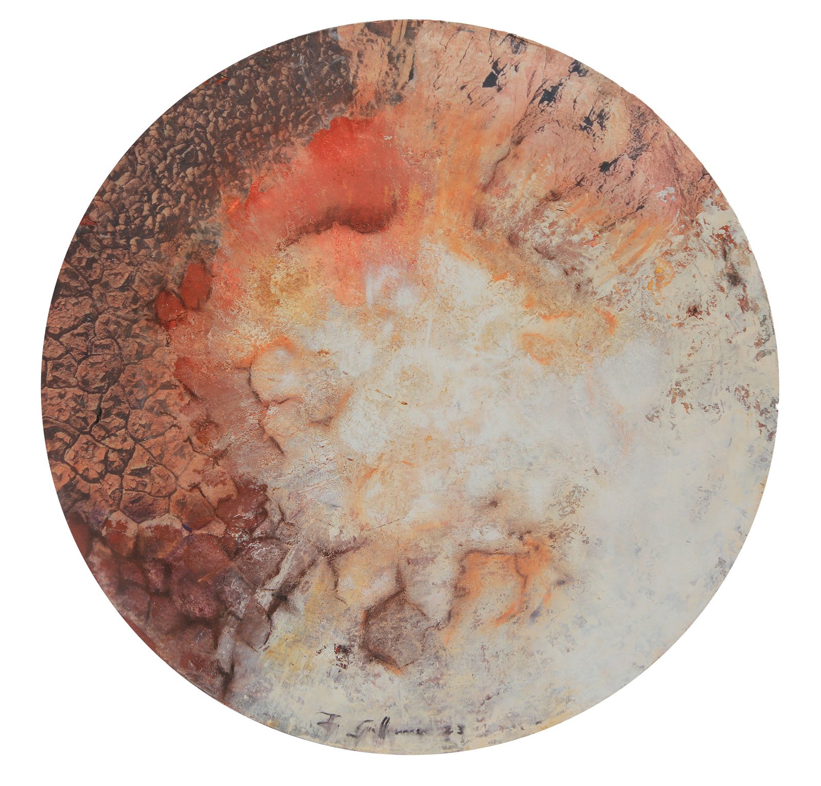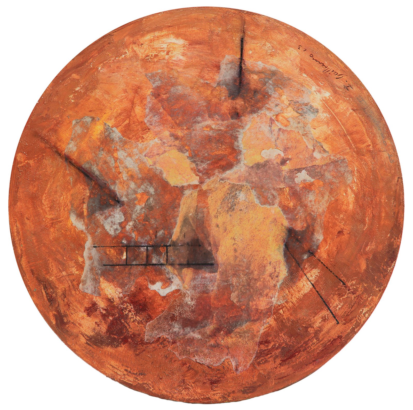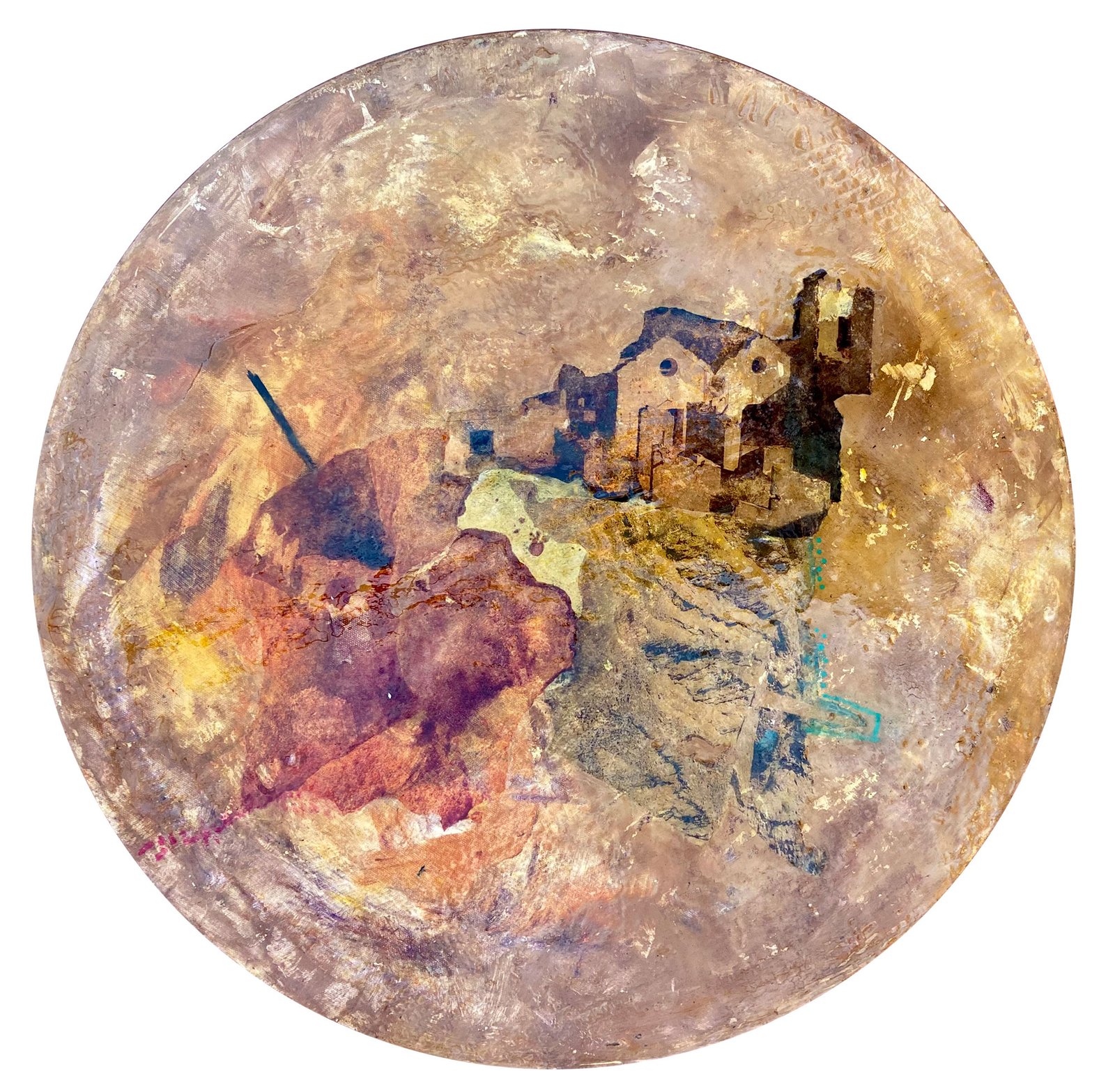 La forma circular se asocia con lo perforado y con los túneles de la tierra. Evoca el recuerdo de épocas difíciles, pero también de aquellas que trajeron prosperidad a nuestras tierras. Al contemplar este formato redondo anclado en la pared, se vislumbra el rostro de la luna con sus cicatrices y los metales incrustados en los poros de la piel terrestre. Se perciben vestigios de vida, impregnados de colores y pigmentos que reflejan el paisaje que llevas en la retina. Esa retina y esa memoria te transportan a recuerdos de conexión con la tierra, tu tierra.